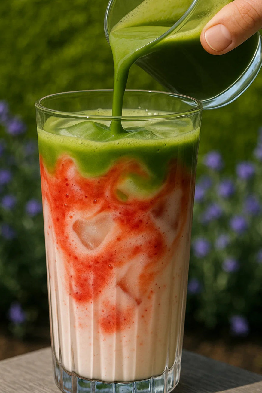 Mische unseren Bio-Matcha mit unserem Bio-Erdbeer- oder Wildheidelbeerpulver!