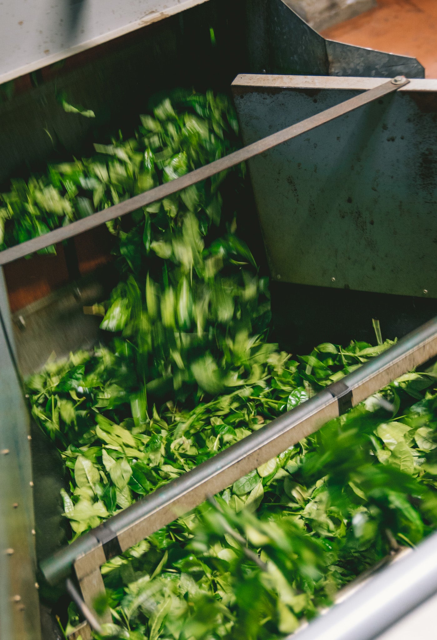 Die Blätter durchlaufen mehrere Maschinen, die Stängel und Äderchen entfernen, bis nur noch das reine, grüne „Blattfleisch“ übrig bleibt. Am Ende wird der Tee auf eine einheitliche Form zugeschnitten.
