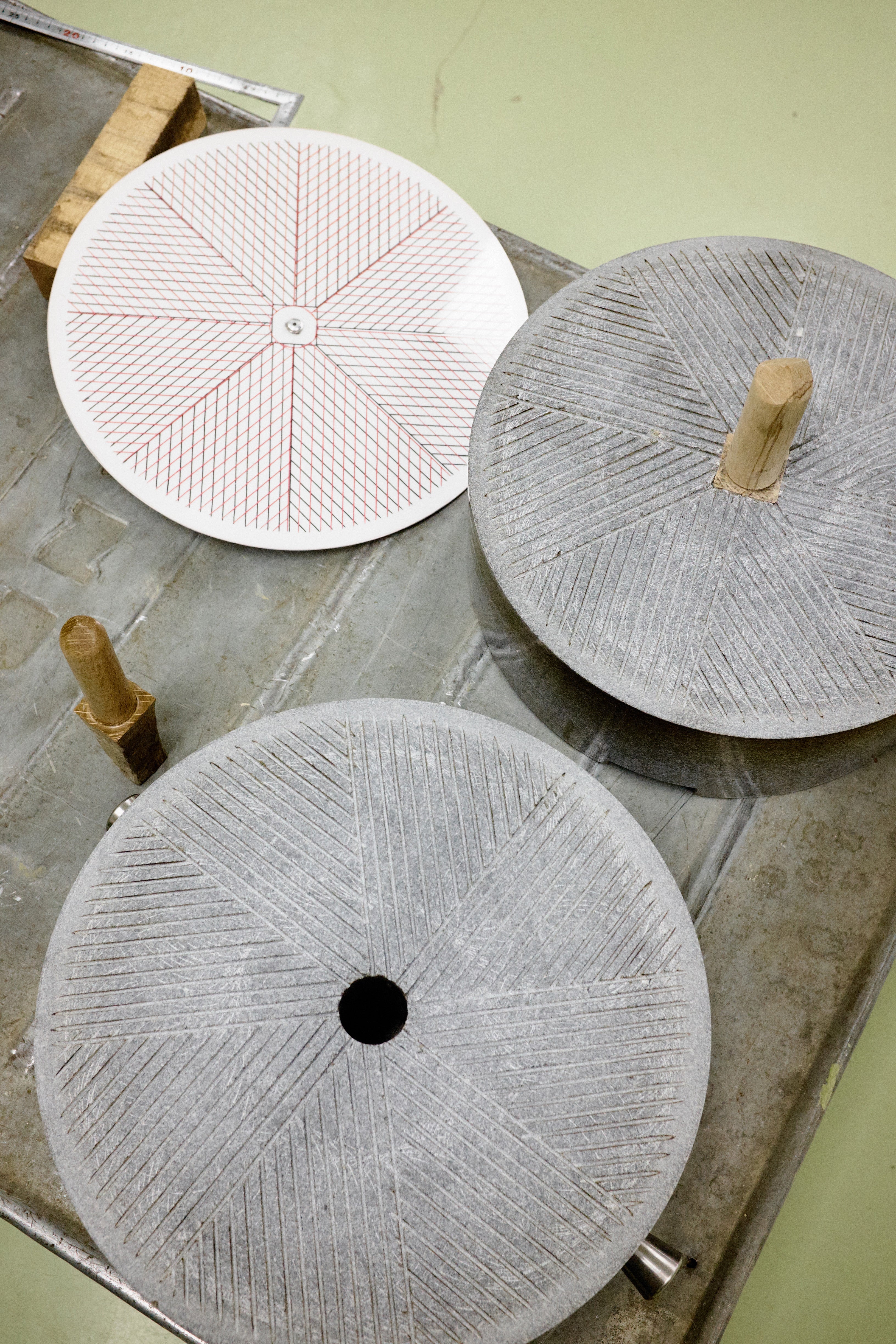 Seit Jahrhunderten werden die speziellen Granitsteinmühlen von ausgebildeten Steinmetzen gefertigt. Die feinen Einkerbungen, die den vermahlenen Tee nach außen drücken, sind nur wenige Millimeter tief und müssen mit größter Sorgfalt eingraviert werden. Die Vertiefung in der Mühle wird zur Mitte hin immer tiefer – mit bloßem Auge kaum sichtbar. Langjährige Erfahrung, das richtige Gespür für den Stein und eine Liebe zum Detail sind entscheidend für den Erfolg unserer Steinmetze.