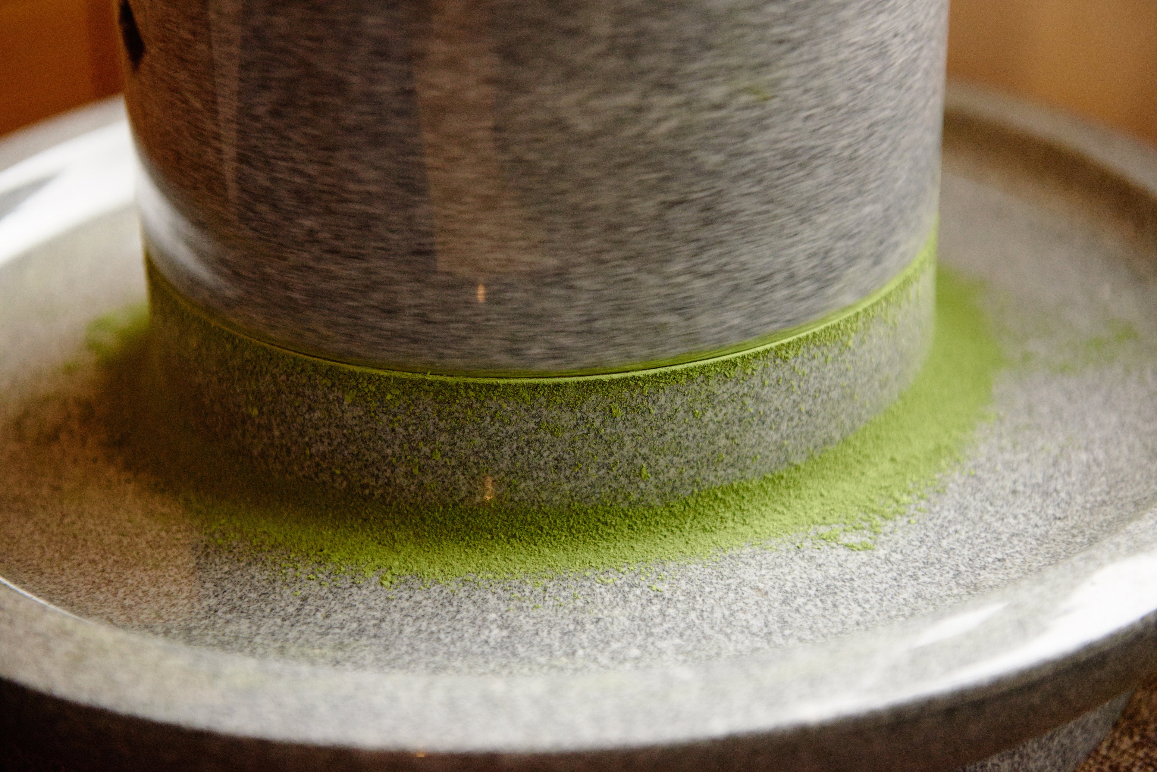 Die letzte Stufe der Produktion erfolgt in der Mühle, wo der Tencha-Tee mit handgefertigten Granitsteinmühlen zu Matcha verarbeitet wird. Eine Steinmühle mahlt in einer Stunde nur etwa 40g Tee, was etwa dem Inhalt einer Dose Matcha entspricht.